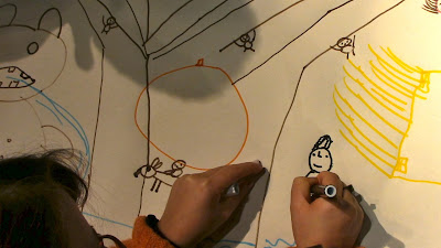 Aqui ficam algumas fotografias tiradas no atelier depois de termos apresentado "Nungu e a Senhora Hipopótamo" no auditório Carlos Paredes em Lisboa - Benfica. Pelo que vi, a divulgação para este espectáculo foi quase nenhuma e foi pena, porque a entrada era gratuita, o que nos tempos que correm é determinante para escolhermos o que vamos ou não vamos ver. Há última da hora, a Isabel fez meia dúzia de telefonemas e a sala lá ficou composta. O espectáculo correu muito bem. Dadas as características do teatro (perfeito para as Histórias Magnéticas), desta vez o público ficou sentado na plateia e testei pela primeira vez o nosso novo sistema de amplificação portátil como PA único para a sala e munição.  Funcionou muito bem. Só precisámos da tela e do projector do Teatro. Foi também a primeira vez que contámos com o Nuno para operar as imagens e dar apoio ao atelier e o seu trabalho foi perfeito! Do atelier, vejam estes desenhos incríveis, cheios de hipopótamos patudos, abóboras, canoas, água e sóis com óculos. Houve conversa animada e muita música com todos a recriar o ambiente da selva à noite.